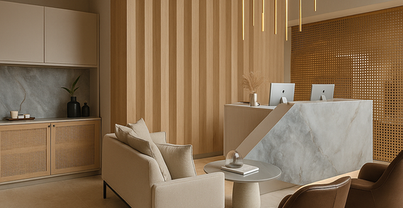 O mobiliário de linhas retas e tons suaves garante funcionalidade e harmonia visual, enquanto a iluminação pendente adiciona um toque moderno e sofisticado ao ambiente. O espaço de recepção é convidativo, com poltronas e sofá dispostos de forma a promover conforto e acolhimento aos visitantes.